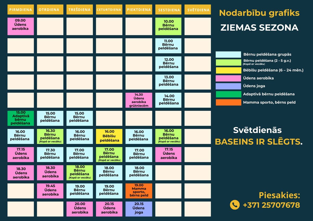 Piedāvājam ūdens aerobikas nodarbības, kas uzlabos fizisko formu un labsajūtu, kā arī bērnu peldētapmācību, nodrošinot drošu un pozitīvu vidi mazajiem ūdens draugiem.